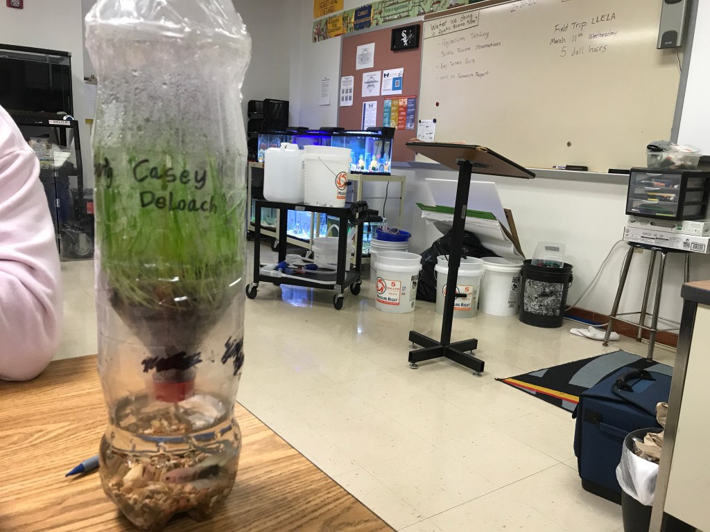 -heavy condensation on the top of the bottle biome. Many water drops on the tips of the plants due to transpiration
